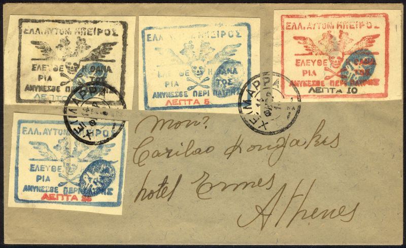 (1.) All covers addressed to Carilao Kongakis, whether in Greek, French or Italian are forgeries. They never went through the mails. (2.) Exp:do. Ref: Hellenic Philatelic Society of America News Bulletin of September 1968.
