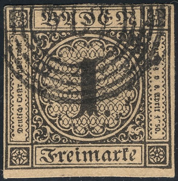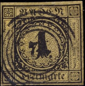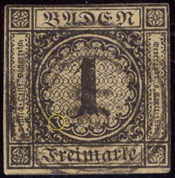 German State, Baden Genuine« Back1851, German State, Baden, Scott #1, Genuine![]() (1.) Secret mark - White dot at the inner edge of the 3rd triangle of the circle outline around numeral "1" moving clockwise from the bottom. This looks like a printing flaw but is actually a secret mark placed on the genuine stamps by the engraver. (2.) Little tongue of the numeral "1" is thin, tapers, and curves slightly. (3.) Six horizontal rows of pear shaped ovals in the background in the circle with small ends up. (4.) "F" of Freimarke does not touch the line above it. (5.) Exp: do. Ref: Earee. 1851, German State, Baden, Scott #1, Genuine![]() (1.) Background lines form pear shaped objects with the small end up. (2.) Little tongue of the numeral "1" slants slightly upward at the end. (3.) Secret mark is present. (A small white dot in the third triangle to the left of 6:00 o'clock at the inner edge of the central circle.) |