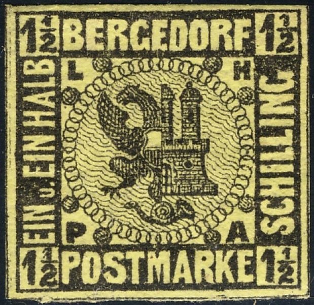 German State, Bergedorf Genuine« Back1861 German State, Bergedorf #3, Genuine![]() (1.) There are 55 linked rings around the perimeter of the central design. (2.) There is a dot in the ring directly below the second "E" of Bergedorf. (3.) There is another dot in the ring to the left of the first "L" of schilling. (4.) There is a distinct ball over the right turret. (5.) The eight balls outside the linked rings all touch both the rings and the frame. (6.) The fraction bar in the upper right corner extends to the frame line. (7.) The eagle's beak does not touch his wing. (8.) The wide end of the posthorn does not touch the castle above it. (9.) The one of the fraction in the lower left corner has two serifs projecting from the top instead of only one. (10.) Exp: do (11.) Ref: Rev. Earee. |