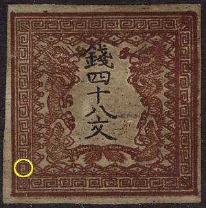 Japan Genuine« Back1871, Japan, Scott #1, Plate I, Genuine![]() (1.) Plate I (solid dots in the diamond shaped links at the top and bottom, and in the half links at the sides of the inner border. (2.) Ten perfect Greek keys on all four sides form the outer border. (3.) Six whole diamond shaped links, and a half link at each end, form the top and bottom of the inner border. (4.) 13 half links form the vertical parts of the inner border at each side. (5.) The design is 19.75 mm square. (6.) The central characters measure 10.5 mm from the apex of the inverted "v" at the top to the lowest part of the right stroke of the lowest character. (7.) Specks of brown, as from a sputtering pen, are usually found scattered about the face of the stamp. (8.) Nine out of ten stamps have a "secret mark", two small dots instead of a solid vertical line for the central stroke of the lowest Greek key on the left side, circled in yellow on the example above. (9.) Exp: ISJP cert. Notes:do. Ref: Aretz. 1981, Japan, Scott #1484a, Genuine![]() (1.) Scanned from the upper left quadrant of the souvenir sheet. (2.) Measures 19.25mm x 19.25mm from the frame lines. (3.) Although this stamp has the secret mark in the lower left key, there is a third dot to the left of the two vertical dots, and a short vertical line below the two vertical dots, which is not seen on the original. (4.) Exp: do. Ref: Scott catalog |