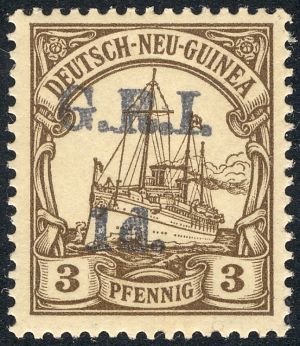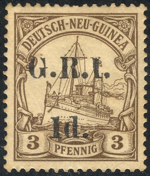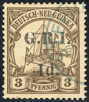New Britain Genuine« Back1914 New Britain #1, Genuine![]() (1.) First setting of October 17, 1914. (2.) Ink of the surcharge is dark (black). (3.) The letters "G.R.I." are 3.3 mm tall. (4.) The space between the lines of the surcharge is 6 mm. (5.) The period after the denomination is farther away from the "d". (6.) Exp: APS certificate. (7.) Notes: do 1914 New Britain #16, Genuine![]() (1.) Second setting of December 16, 1914. (2.) The letters of "G.R.I." are 3.3 mm tall, the same as #1. (3.) The space between the lines of the surcharge is 5 mm. (4.) The period after the denomination is relatively far away from the "d". (5) Exp: APS certificate. (6.) Notes: do |
