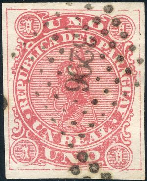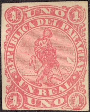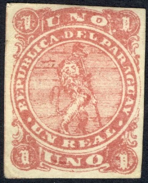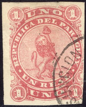 Paraguay Genuine« Back1870, Paraguay, Scott #1, Genuine![]() (1.) Counting on the left side from under "DEL" to the thick, slightly sloping line representing the horizon, just above the "U" of UN there are 58 thin even horizontal lines of shading in the background. (2.) These lines are drawn right through the pole the lion is holding. (3.) The liberty cap does not touch the circle above it. (4.) There is a patch of white, devoid of shading, on the lion's thigh. (5.) The upper serifs at the numerals "1" in the corners end with a sort of a knob. (6.) There are 3 dots in each of the numerals "1" of the denomination. (7.) Exp:do. Ref: Earee. |
