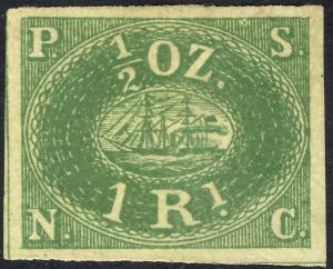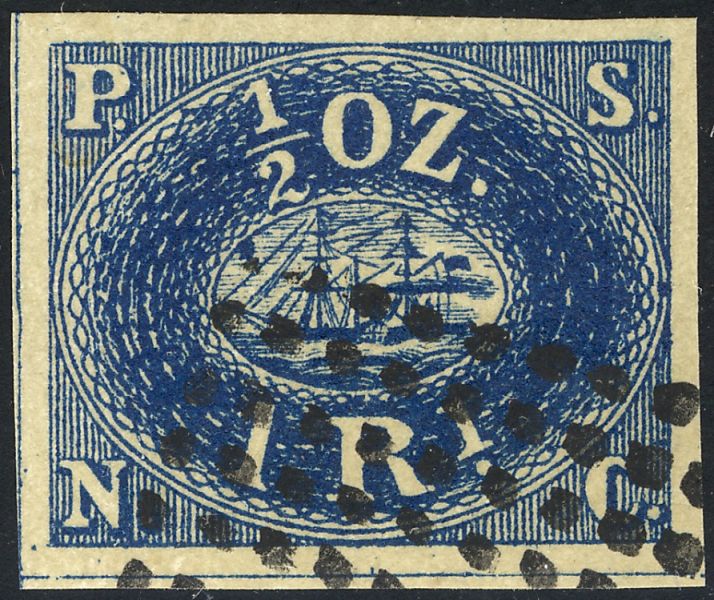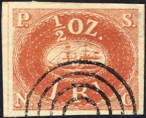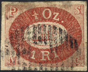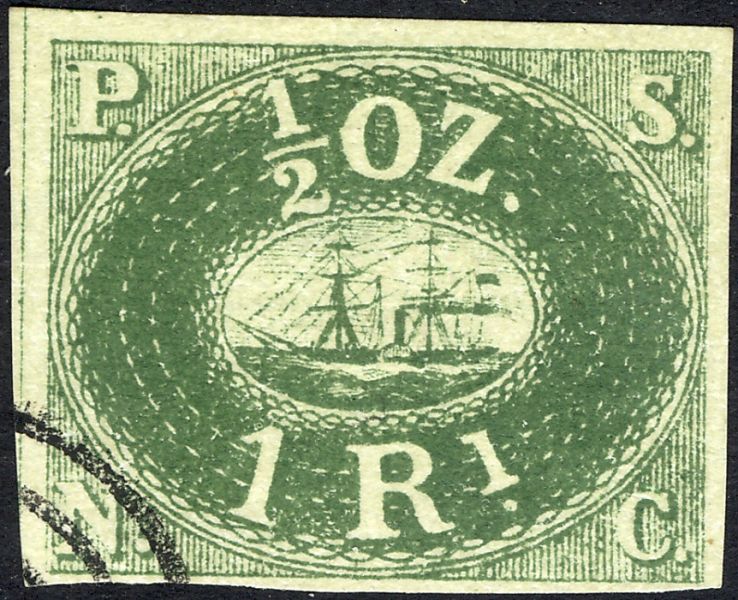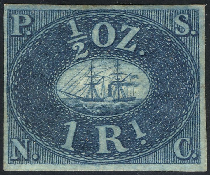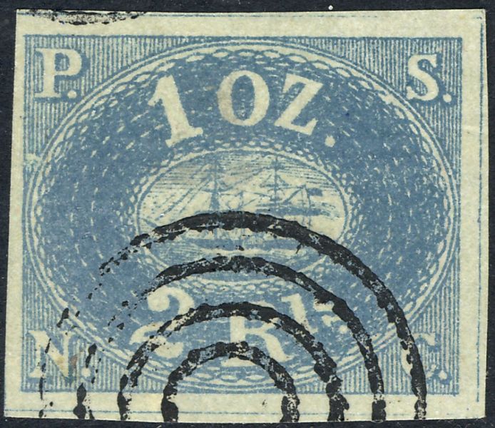 Peru, Pacific Steam Navigation Company Genuine« Back1857 Peru #1, Genuine![]() (1.) Thick blued wove paper (approximately .0049" average, this stamp has gum). (2.) The serifs at the back of the "P" touch the 3rd vertical line of the background, counting from the left. The shadow of the "P" ends at the 16th line. (3.) The dot after the "P" from its left side to the shadow on its right side is situated between the 12th and 16th lines from the left. (4.) The curve at the back of the "S" at the upper part of the stamp touches the 15th line from the right, and the shadow at the right of this top part of the "S" ends between the 5th and 6th lines from the right. (5.) The serifs at the left vertical stroke of the "N" touch the 2nd line from the left. The shadow of the "N" extends almost to the 13th line from the left. (6.) The "C" and the dot after it are situated between the 2nd and 16th lines from the right. (7.) The 2 solid lines around the perimeter of the oval are close together (about .1 mm apart). (8.) There are 49 "chain links" around the perimeter of the oval including one partially hidden by the "1" of the fraction for "1/2 oz.". (9.) Exp: Behr cert. Notes: do. Ref: Earee. |