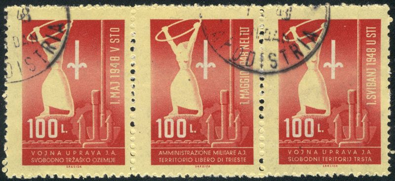 Yugoslavia, Trieste, Zone B Genuine« BackYugoslavia, Trieste, Zone B #3a![]() (1.) Strip of 3. (2.) Inscribed in the languages of three countries, (3.) The first stamp in the strip is inscribed in Slovenian. It is Scott #3. (4.) The second stamp in the strip is inscribed in Italian. It is Scott #1. (5.) The third stamp in the strip is inscribed in Croatian. It is Scott #2. (6.) At least one Italian catalog lists the three stamps #'s 1,2,3, in the order in which they are printed in the strip, but Scott lists them the way they are shown here. |